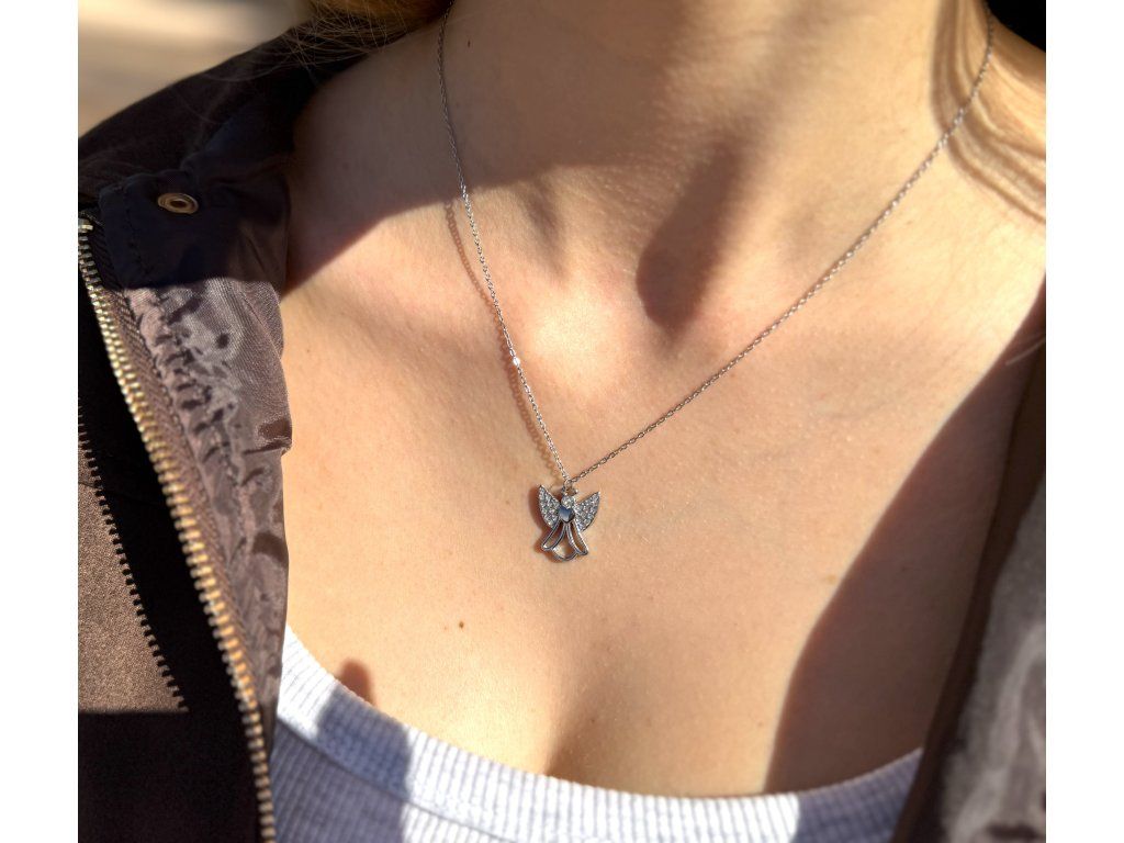 Stylový náhrdelník z chirurgické oceli s motivem anděla zdobený drobnými zirkony. Vhodný i jako dárek.
