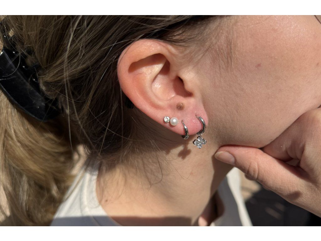 Jemné náušnice z chirurgické oceli s přívěskem čtyřlístku s drobnými bílými zirkony. Naprosto univerzální dámský šperk. Přívěsek z náušnice můžete kdykoliv lehce vyvléknout a nosit náušnice jako samostatné kroužky. Dvoje náušnice v jednom budou i skvělým dárkem pro kamarádku, kolegyni, maminku nebo dceru. Můžete také kombinovat s náhrdelníkem stejného designu a vyladit tak outfit k dokonalosti.