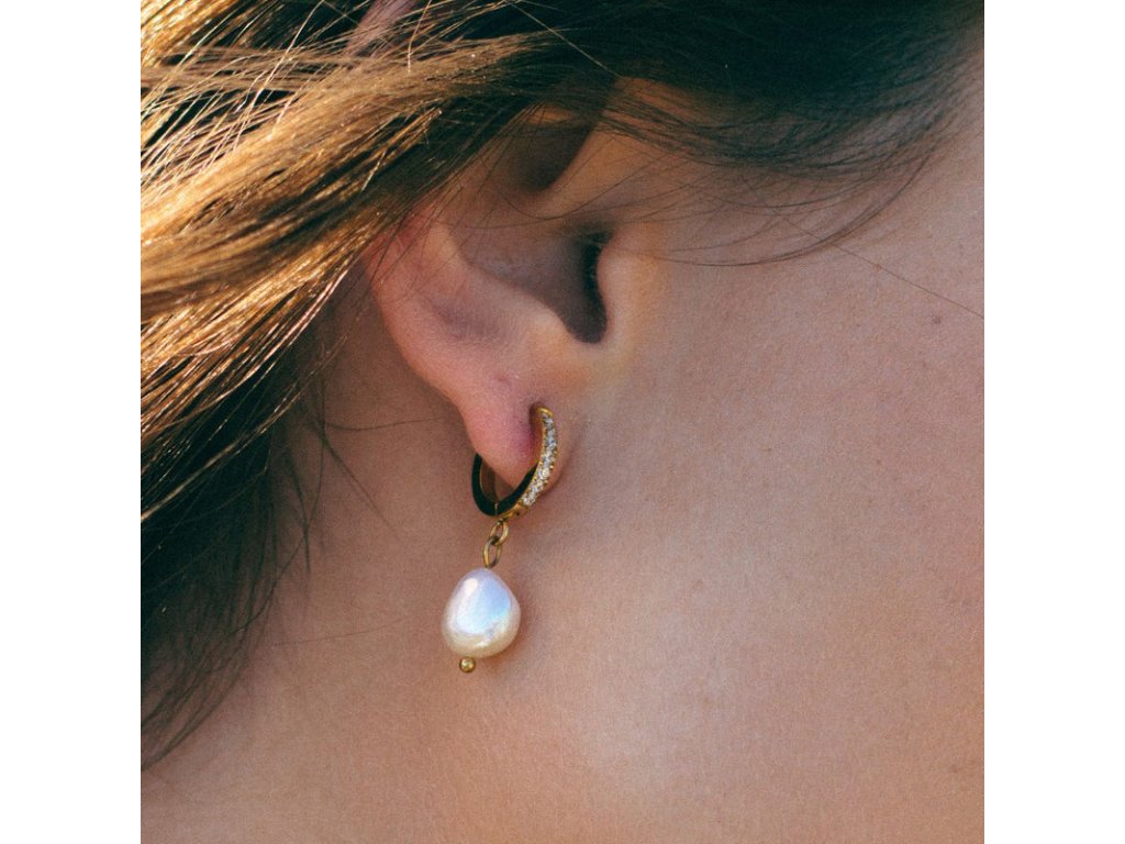 Zajímavě zpracované náušnice tvaru kruhu s perlou, pozlacené 18k zlatem zaujmou na první pohled. Hodí se ke každému outfitu i pozlacenému náhrdelníku.
