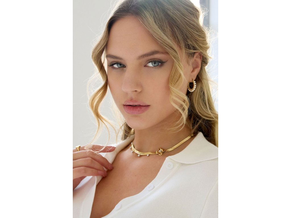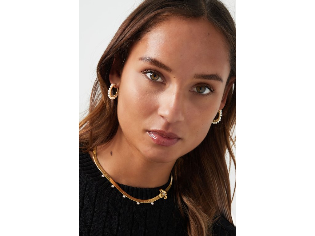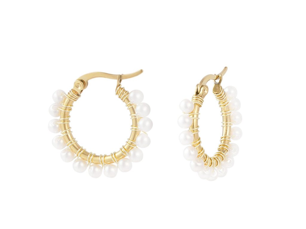 Pozlacené polokruhové náušnice z chirurgické oceli s imitací perel. Náušnice jsou pozlacené 18k zlatem a mají po svém obvodu každá 5 perel.