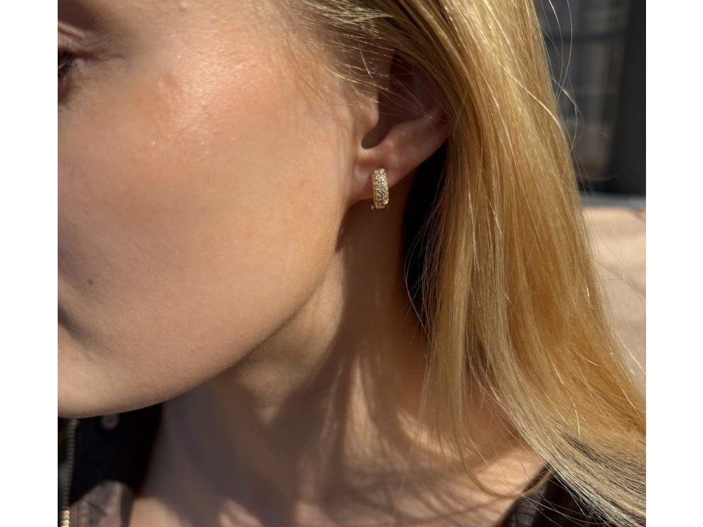 Pozlacené kruhové náušnice s drobnými zirkony. Velice elegantní a zajímavě zpracované náušnice, které se hodí ke každému outfitu. Zajímavě zpracované náušnice ve tvaru polokruhu působí velmi jemně a přesto nepřehlédnutelně. Ideální i jako dárek pro své milované nebo jako radost pro sebe.
