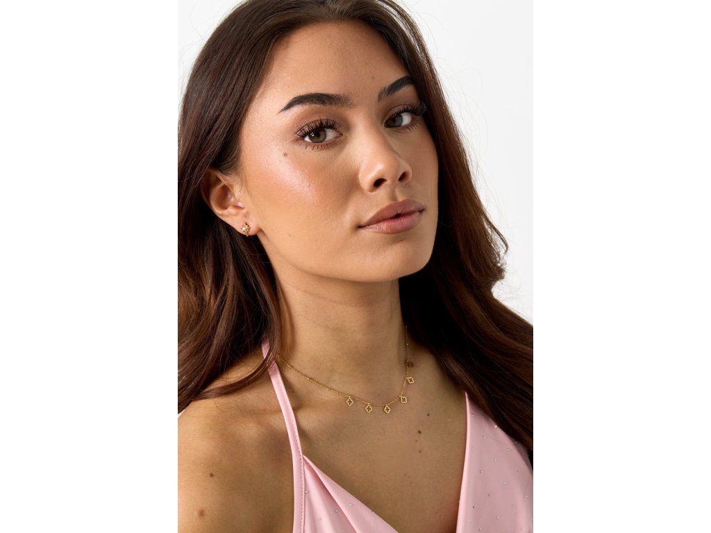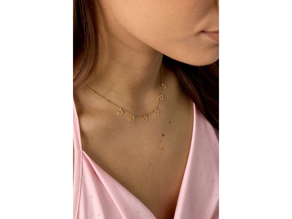 Jemný náhrdelník z chirurgické oceli pozlacený 18k zlatem a ozdobený decentními čtyřlístky. Něžný šperk pro každou ženu.