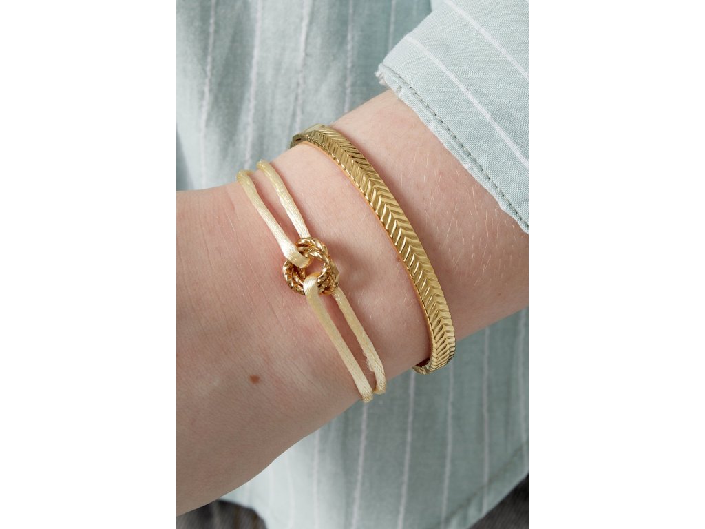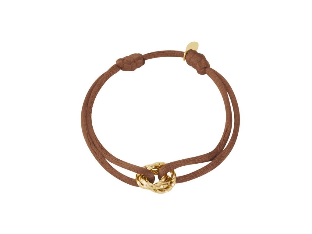 Módní náramek na ruku z hedvábné šňůrky a přívěsku ve tvaru dvojitých kruhů. Přívěsek tvaru dvojitých kruhů je vyrobený z kvalitní chirurgické oceli a pozlacený 18k zlatem. Velikost náramku je možné libovolně upravovat podle obvodu zápěstí. Náramek se zatažením za šňůrky roztáhne a zatažením za uzlíky se opět stáhne.
